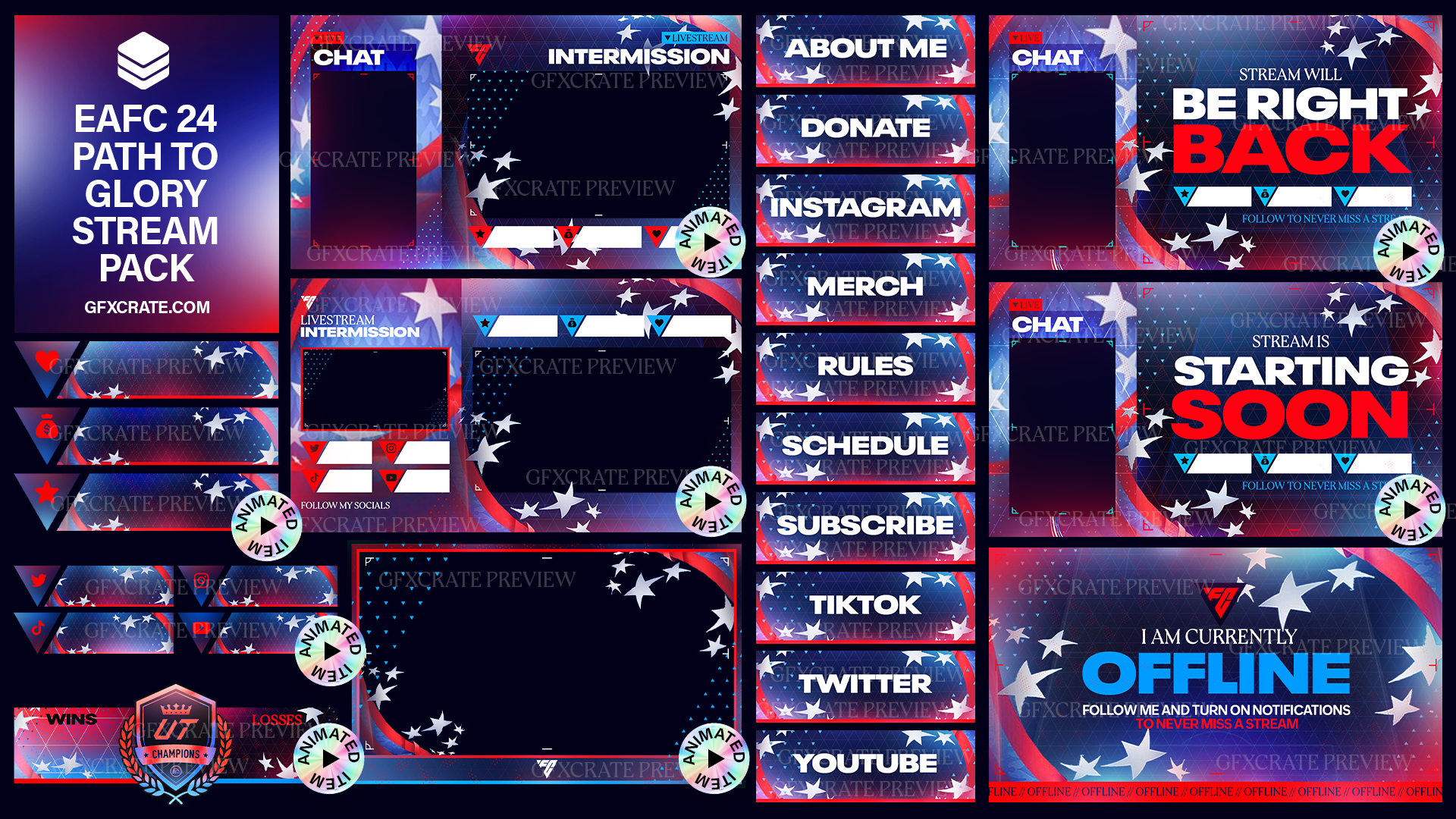 Contains 10 Panels, 2 Intermission Screens, 1 Starting Soon Screen, 1 Be Right Back Screen, 1 Offline Screen, 1 Facecam Overlay, 1 FUT Champs Record Overlay, 1 Activities Overlay and 1 Socials Overlay. 8 of these products are animated.