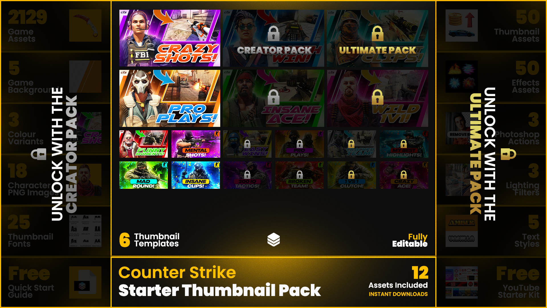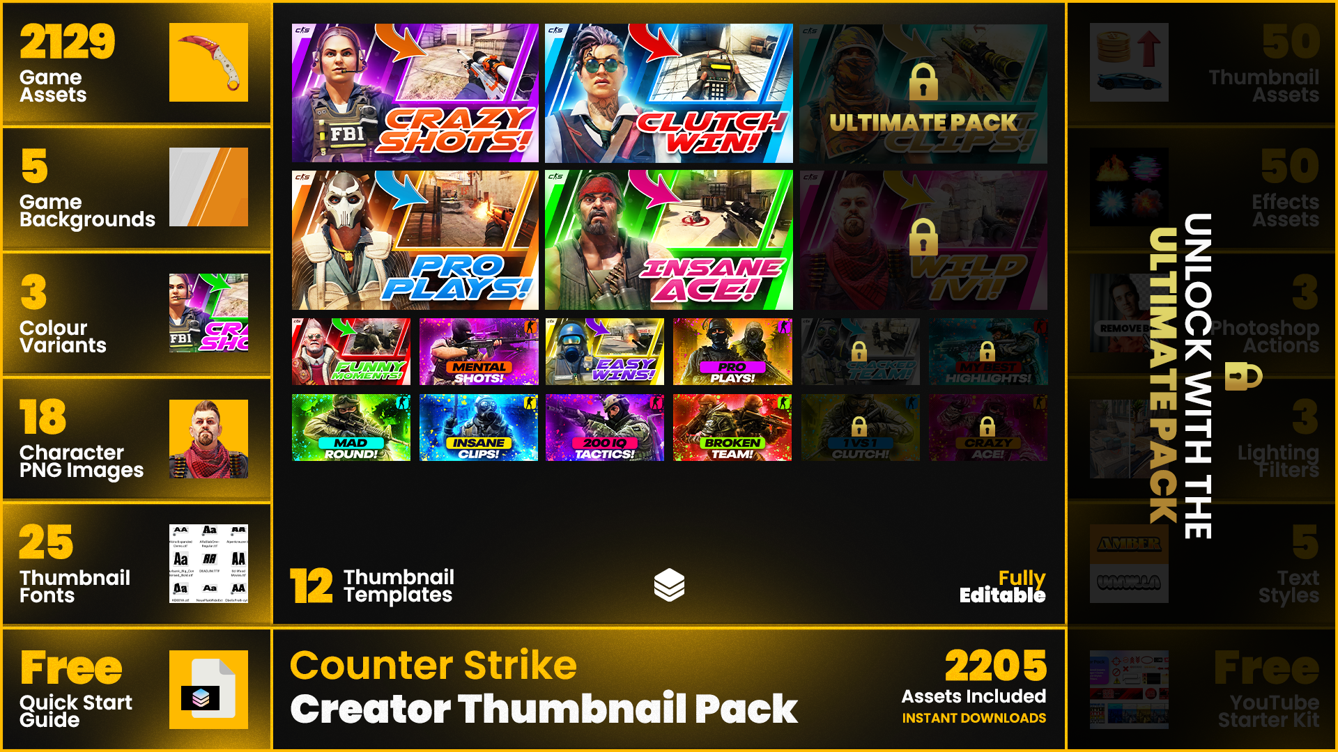 Our high-quality Counter-Strike thumbnail and asset packs are available in 3 tiers - Starter, Creator and Ultimate. Choose the pack which suits you best - each has different amounts of professional CS thumbnails and assets included, purchasing the Ultimate Pack will gain you access to 18 thumbnails as well as 1488 Counter-Strike assets with just one purchase!