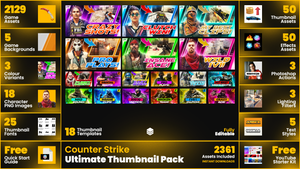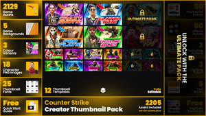 The Ultimate Pack includes the maximum amount of fully editable thumbnails and thousands of Counter-Strike 2 and thumbnail related assets for your YouTube channel, it includes a wide range of thumbnail designs and a vast selection of extras, assets, guides, files and tools to help boost your thumbnails and channel!