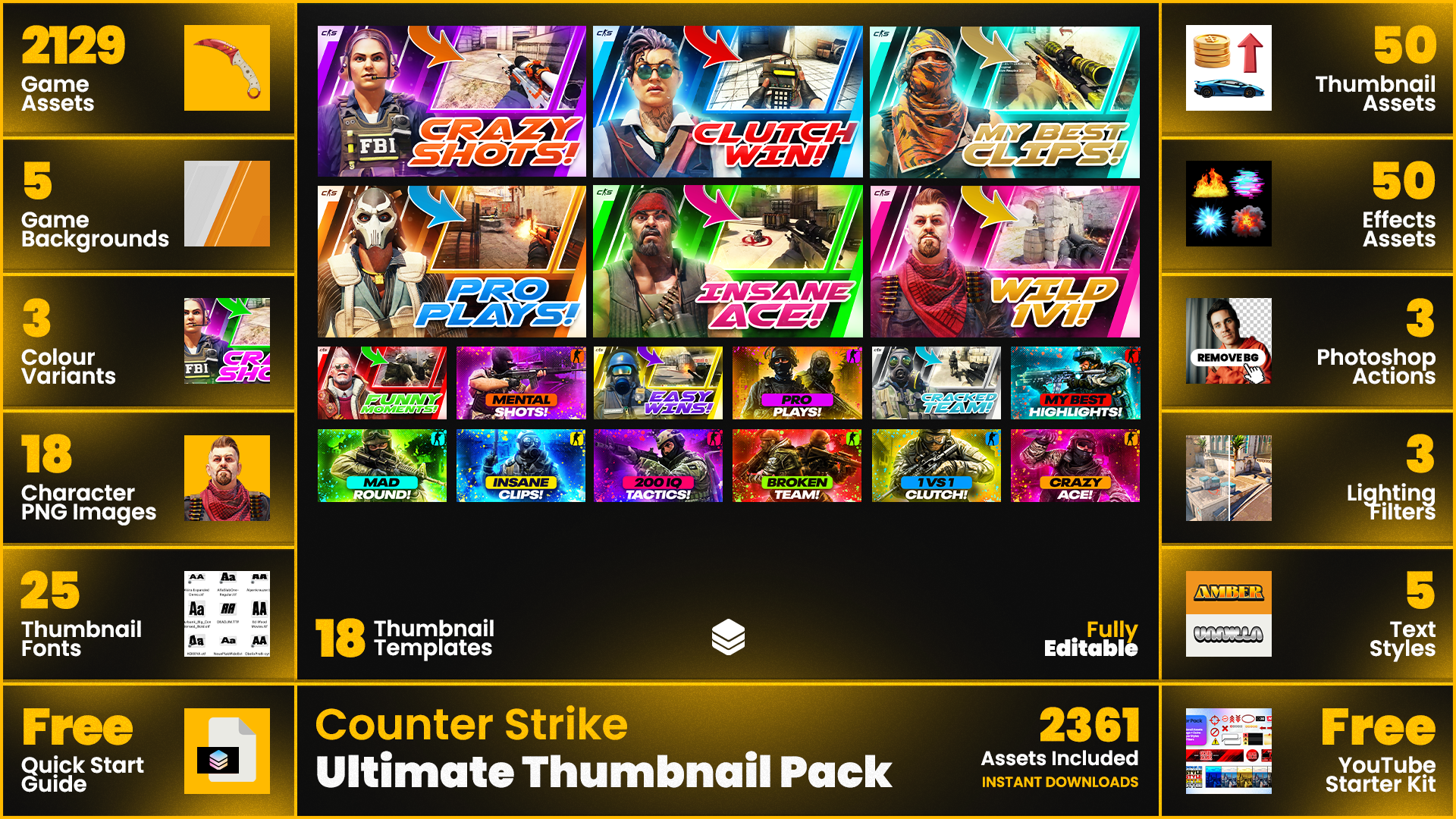 📂 18 .PSD Counter-Strike Thumbnail Files ➕ 18 .PNG Counter-Strike Thumbnail Files ➕ 2129 Counter-Strike Assets ➕ 5 Counter-Strike Backgrounds ➕ 3 Thumbnail Colour Variants ➕ 18 Transparent .PNG Counter-Strike Character Images ➕ 25 Popular Thumbnail Fonts ➕ A Thumbnail Pack Quick Start Guide ➕ 50 Thumbnail Assets ➕ 50 Effects Assets ➕ 3 Photoshop Actions ➕ 3 Photoshop Lighting Filters ➕ 5 Photoshop Text Layer Styles ➕ YouTube Starter Kit (20x Thumbnail Assets, 5x Layer Styles, 5x Lighting Filters, 1x YouTube Banner, 1x YouTube Profile Picture + 1x YouTube Outro)