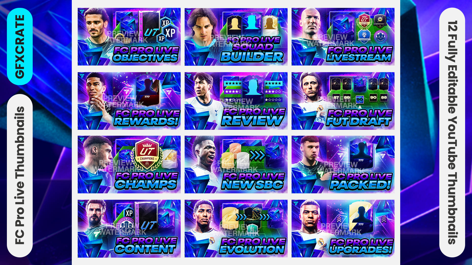 Get your channel ready for the FC Pro Live promo with these professional-looking thumbnails for FC 25! You can also edit all of them as much as you want to switch them up and make them truly yours!
