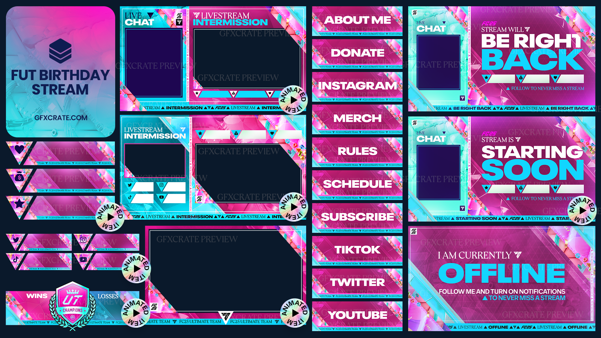 Included are items such as overlays, facecams and screens to make your FC 25 FUT Birthday livestream look great! Simply purchase and with our instant downloads you will be ready to use the files in your streaming software in seconds.