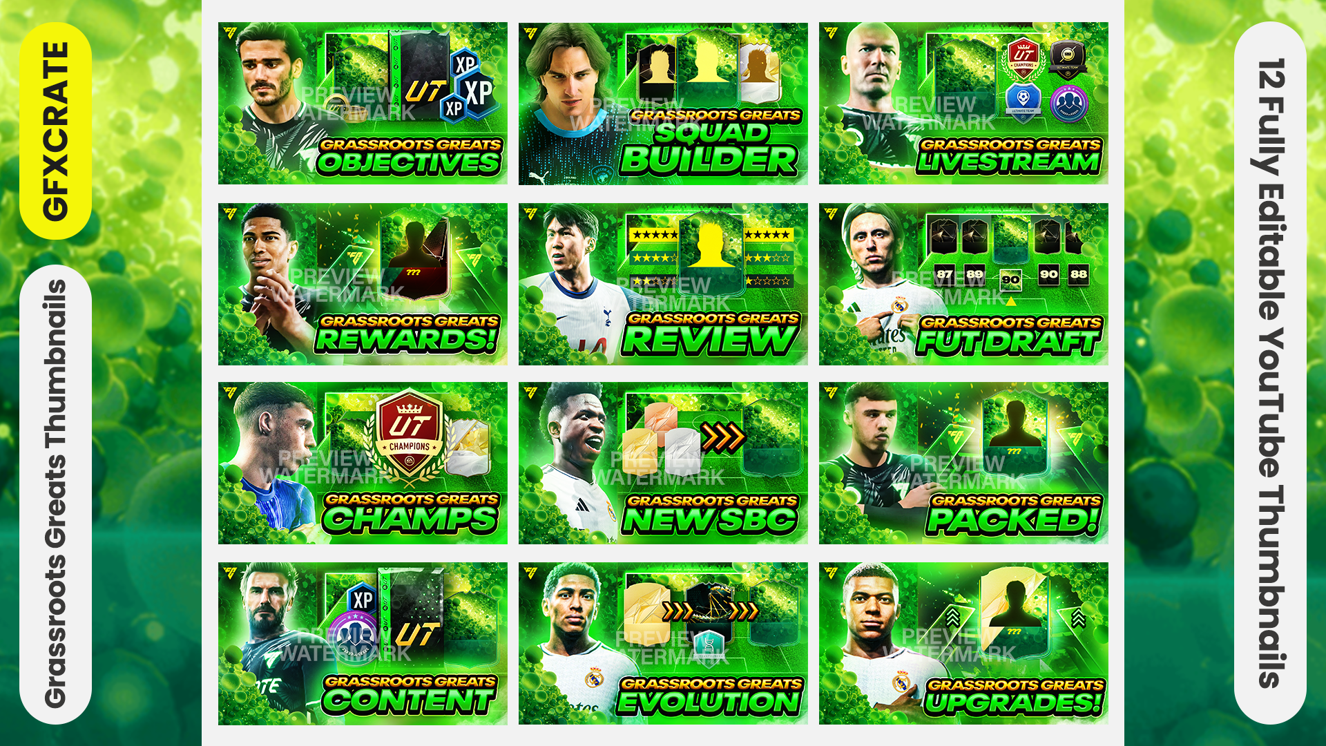 Get your channel ready for the Grassroots Greats promo with these professional-looking thumbnails for FC 25! You can also edit all of them as much as you want to switch them up and make them truly yours!
