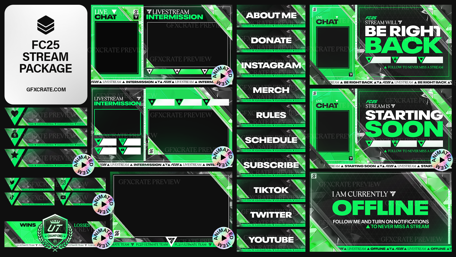 10 Description Panels, 2 Intermission Screens, 1 Starting Soon Screen, 1 Be Right Back Screen, 1 Offline Screen, 1 Facecam Overlay, 1 FUT Champs Record Overlay, 1 Recent Activities Overlay, 1 Socials Overlay.