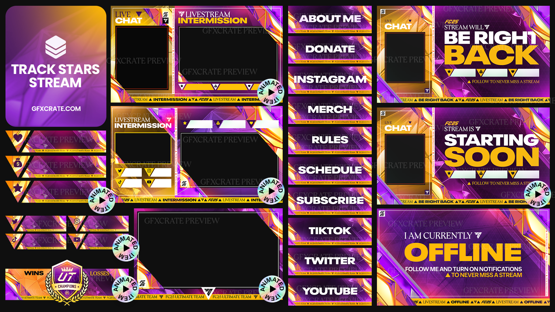 Included are items such as overlays, facecams and screens to make your FC 25 Track Stars livestream look great! Simply purchase and with our instant downloads you will be ready to use the files in your streaming software in seconds.