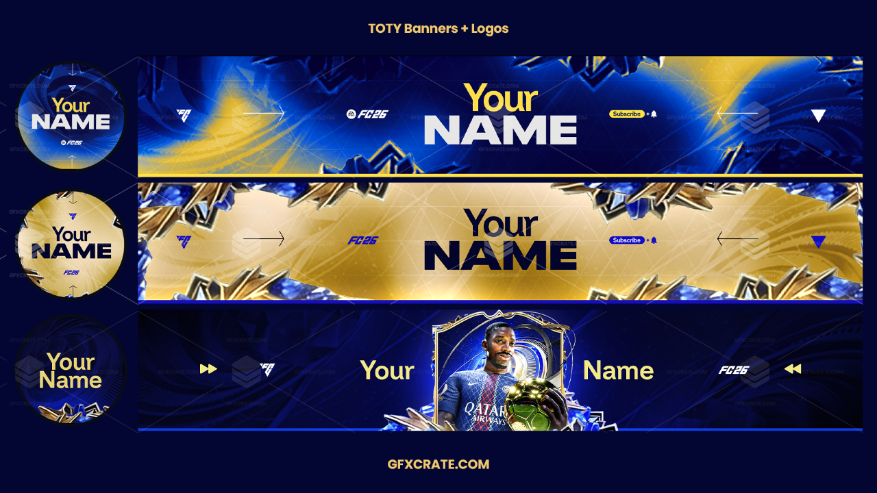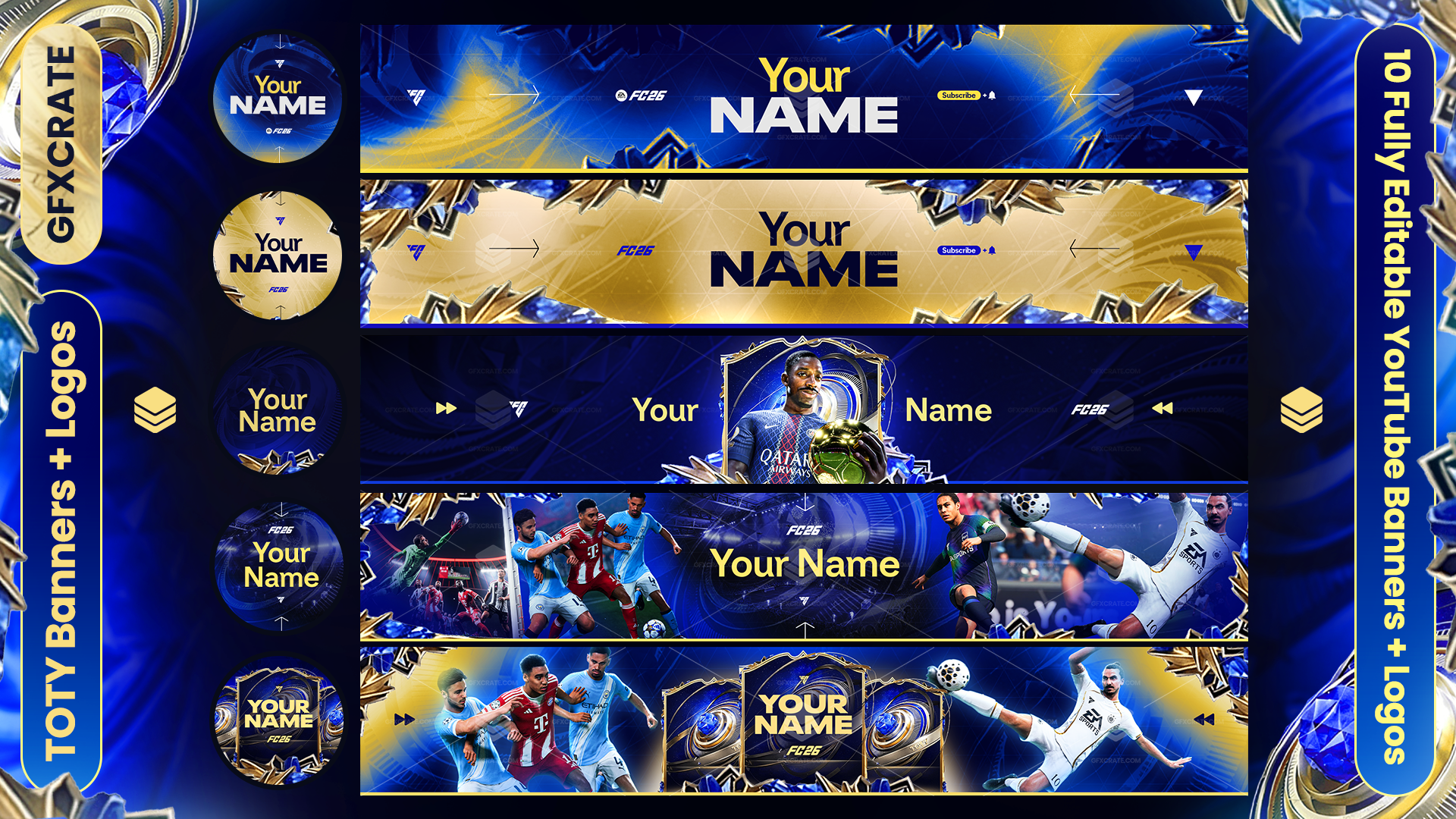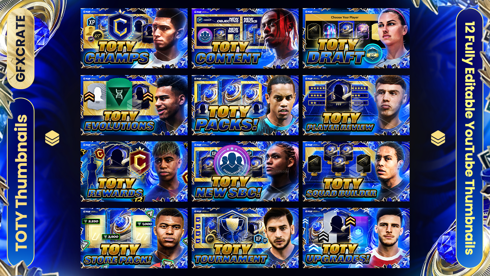 The thumbnail pack includes 12 thumbnails and the banner pack includes 5 banners with 5 matching logos to give you a choice for which banner or thumbnail to use so your channel can look slick for TOTY.