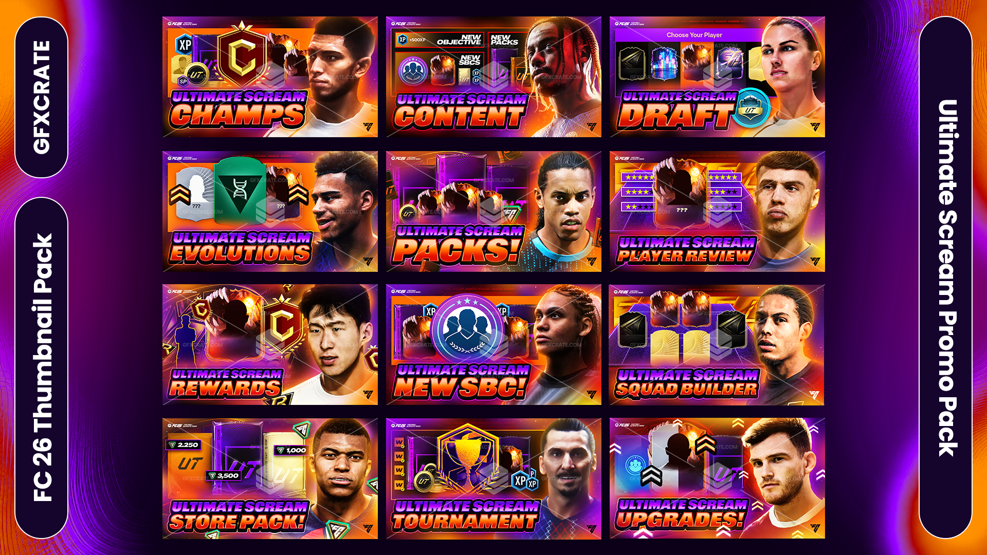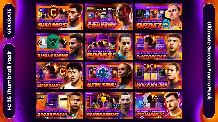 Get your channel ready for the Ultimate Scream promo with these professional-looking thumbnails for FC 26! You can also edit all of them as much as you want to switch them up and make them truly yours!