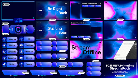 Get your stream ready for the UEFA Primetime promo on EAFC 26 with this professional-looking stream template pack! Perfect for Twitch, YouTube and Facebook streams or for any other streaming site.