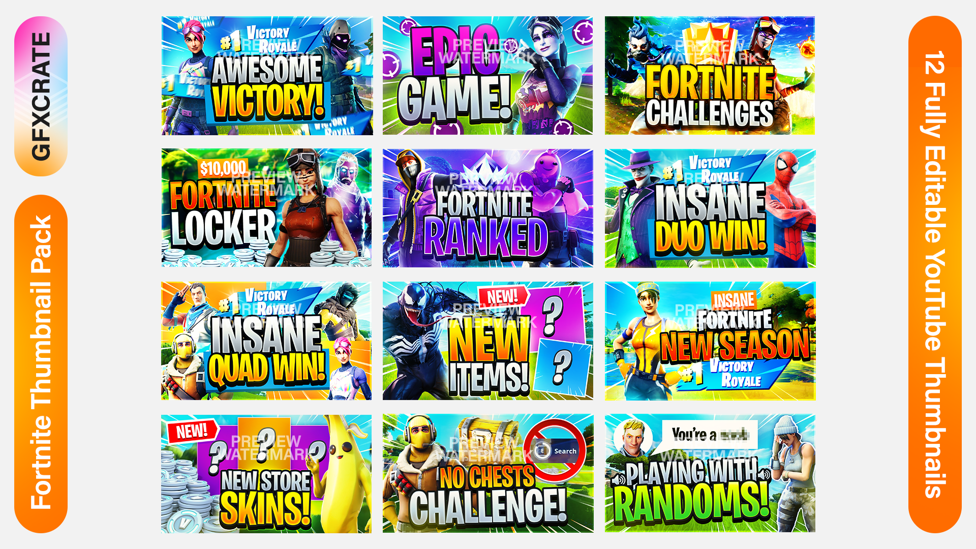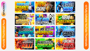 Get your Fortnite channel looking fresh with these professional-looking thumbnail templates! You can also edit all of them as much as you want to switch them up and make them truly yours!