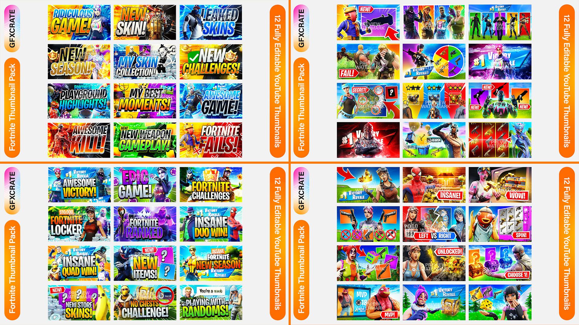 This pack bundle includes 48 fully editable .psd thumbnails for Fortnite content on YouTube! Featuring our V1, V2, V3 and V4 Fortnite Thumbnail Packs for quadruple the thumbnails at a discounted cost!