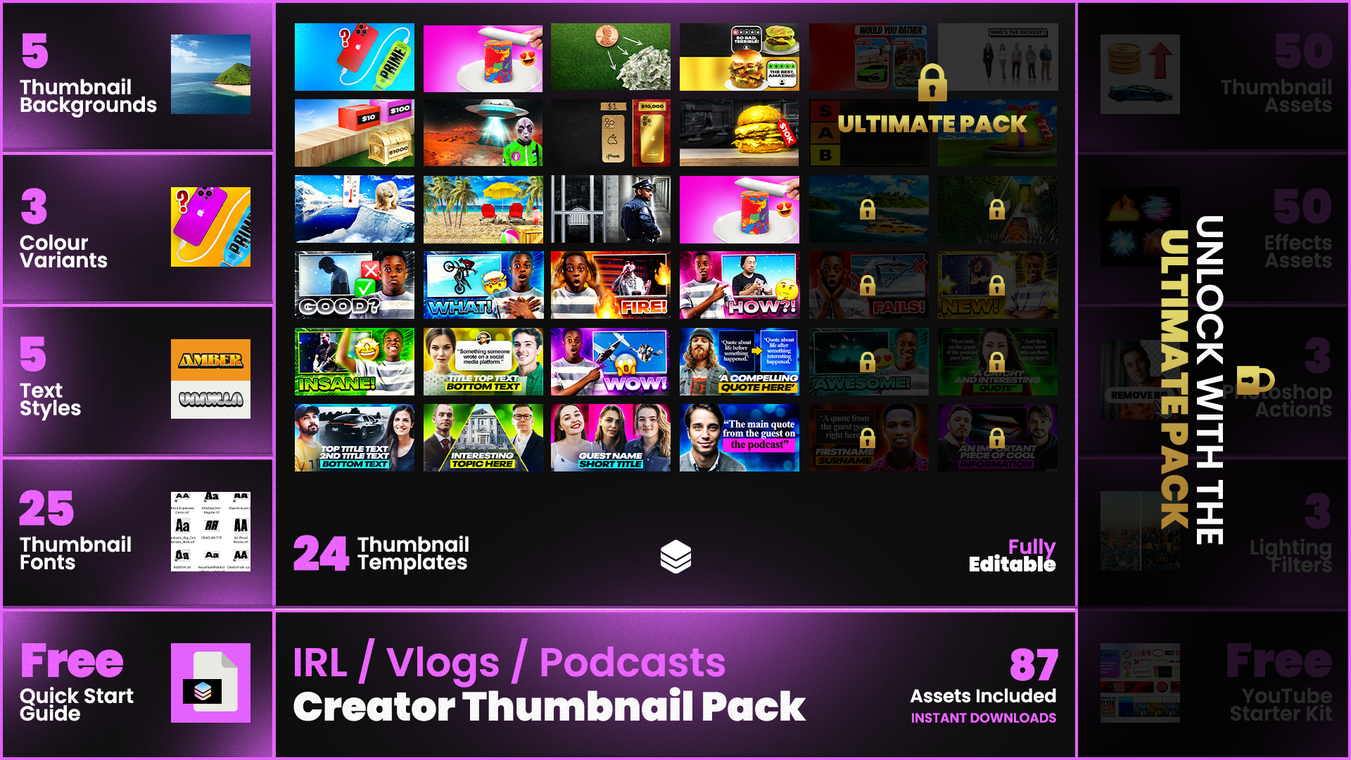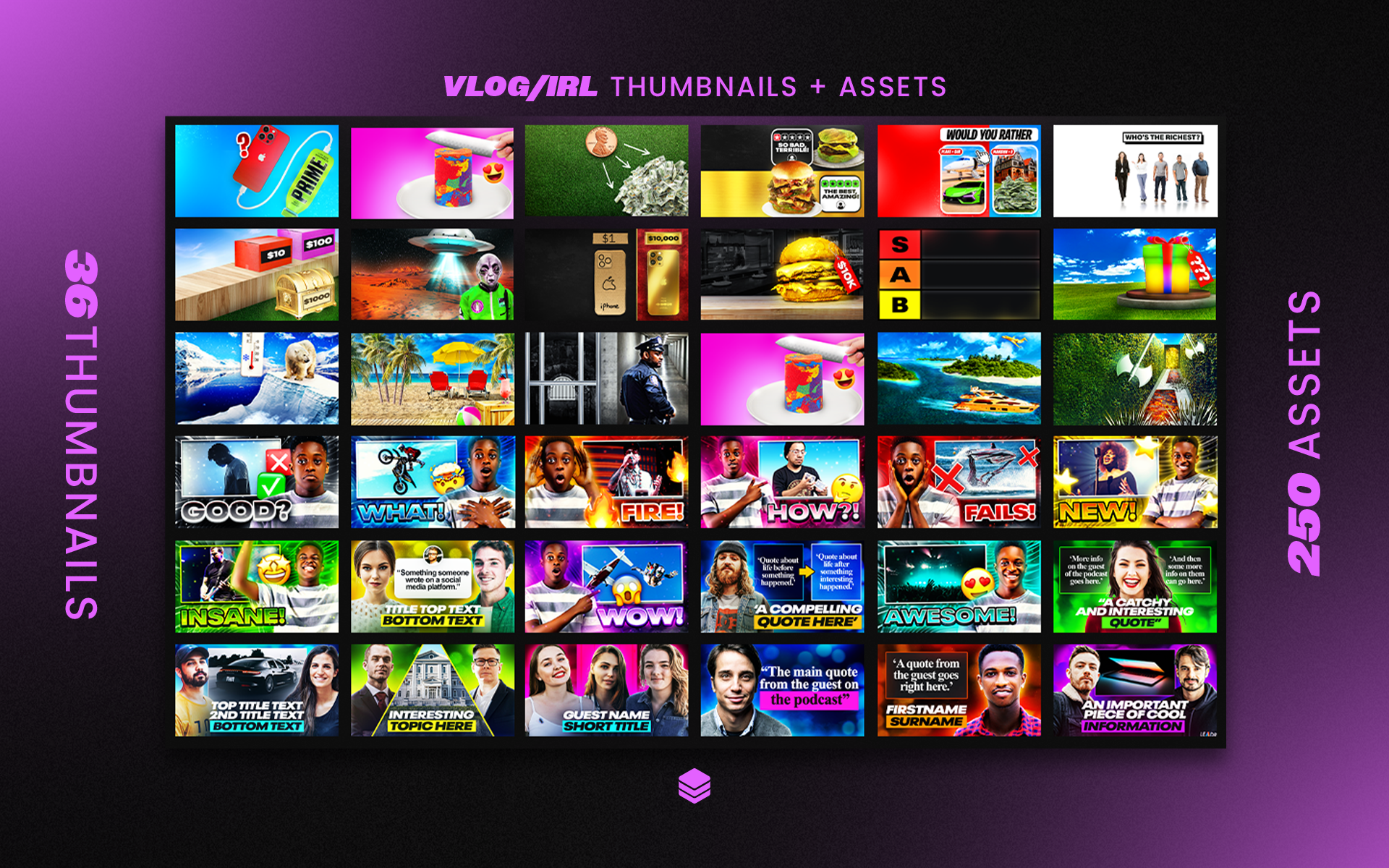 Our high-quality IRL / Vlog / Reaction / Podcast thumbnail and asset packs are available in 3 tiers - Starter, Creator and Ultimate. Choose the pack which suits you best - each has different amounts of professional IRL thumbnails and assets included, purchasing the Ultimate Pack will gain you access to 36 thumbnails as well as 250 other assets with just one purchase!