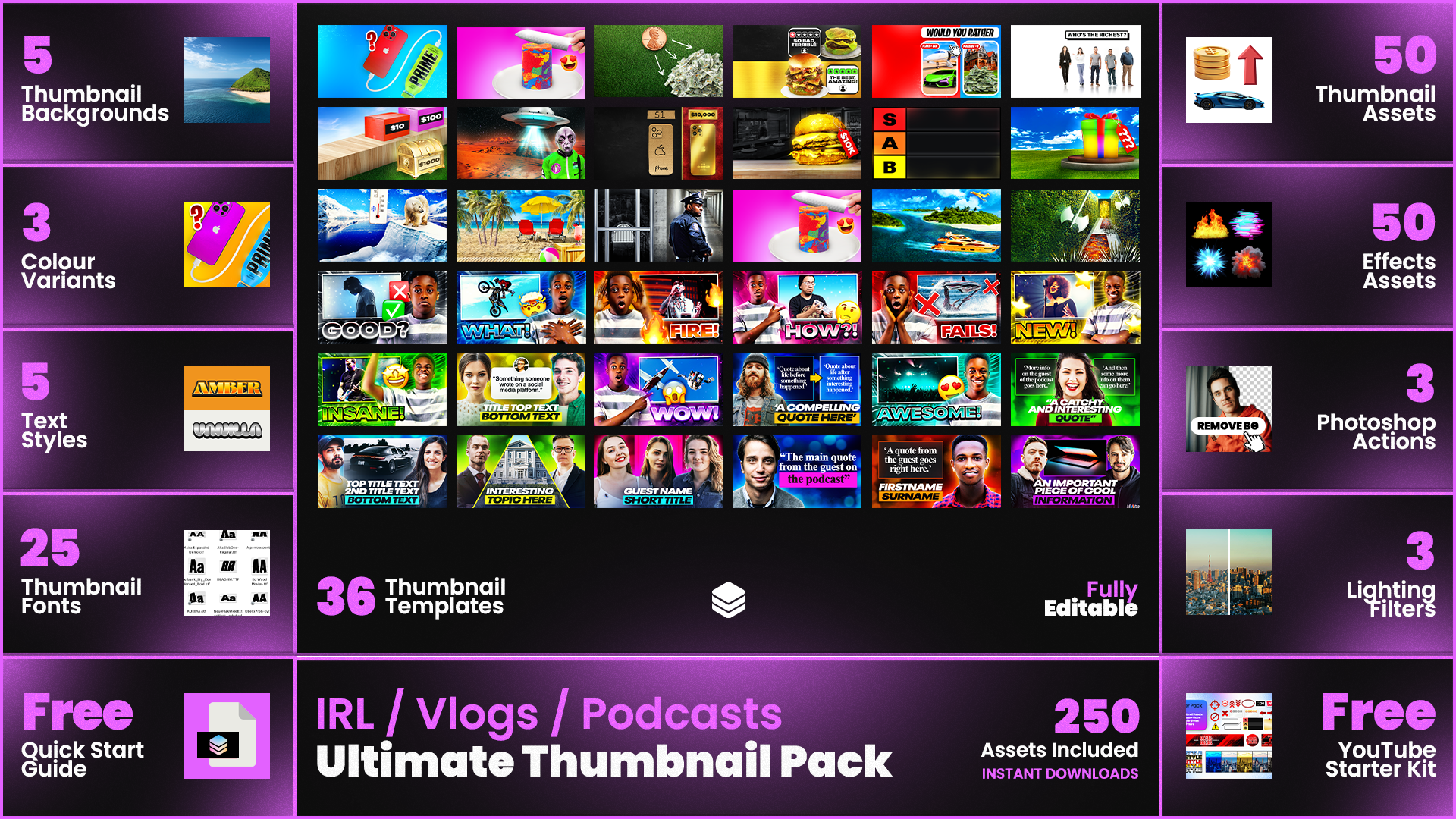 📂 36 .PSD Vlog / IRL Thumbnail Files ➕ 36 .PNG Vlog / IRL Thumbnail Files ➕ 5 Thumbnail Backgrounds ➕ 3 Thumbnail Colour Variants ➕ 25 Popular Thumbnail Fonts ➕ A Thumbnail Pack Quick Start Guide ➕ 50 Thumbnail Assets ➕ 50 Effects Assets ➕ 3 Photoshop Actions ➕ 3 Photoshop Lighting Filters ➕ 5 Photoshop Text Layer Styles ➕ YouTube Starter Kit (20x Thumbnail Assets, 5x Layer Styles, 5x Lighting Filters, 1x YouTube Banner, 1x YouTube Profile Picture + 1x YouTube Outro)