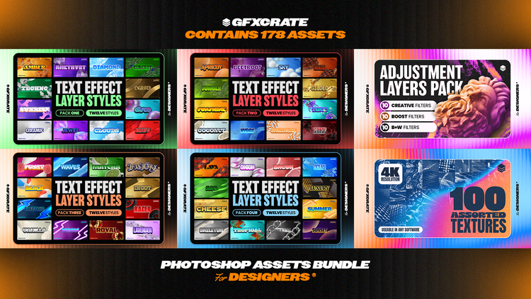 Take your Photoshop projects to the next level with the Photoshop Assets Bundle by GFXCRATE. In it you'll get over 178 unique text layer styles, textures and adjustment layers to help upgrade your designs in seconds.