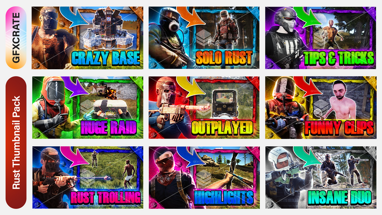 This pack includes 9 fully editable .psd thumbnails for Rust!
